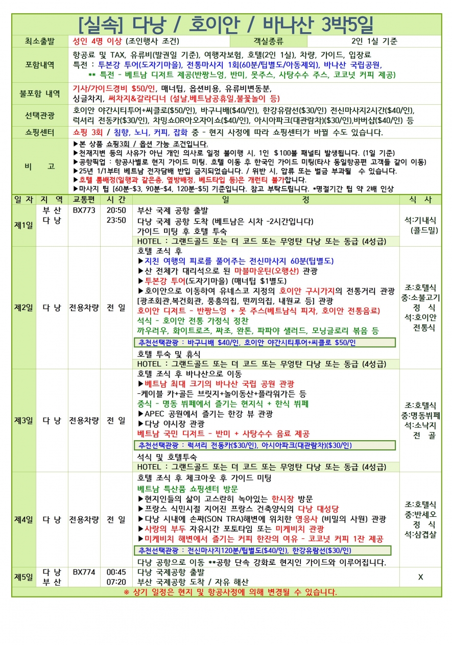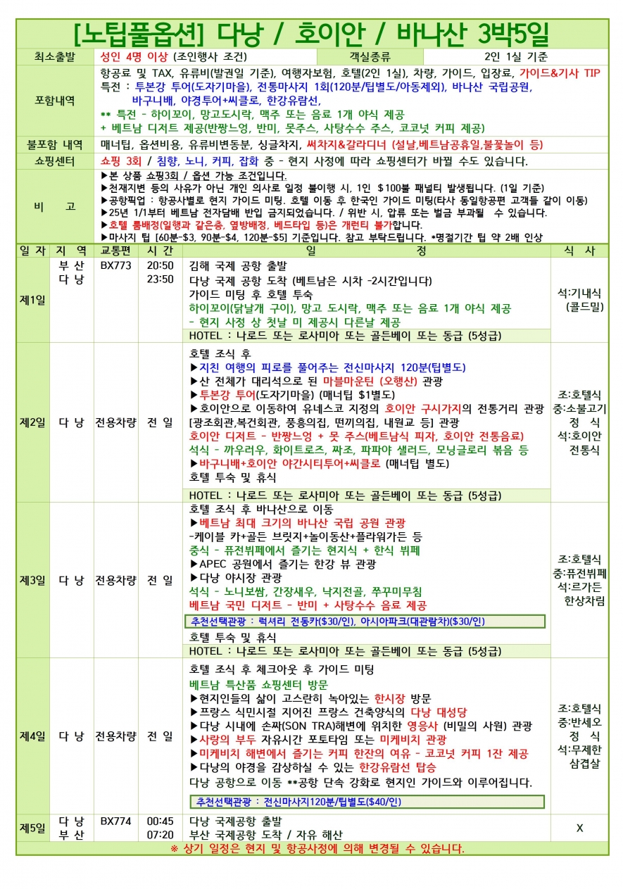 ★특가포함★[해외] 베트남 다낭 3박5일 노팁/노옵션[김해공항개별]