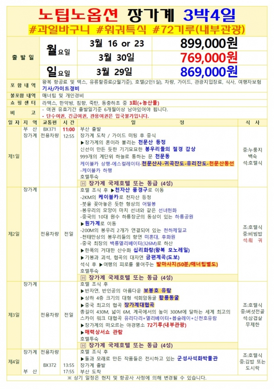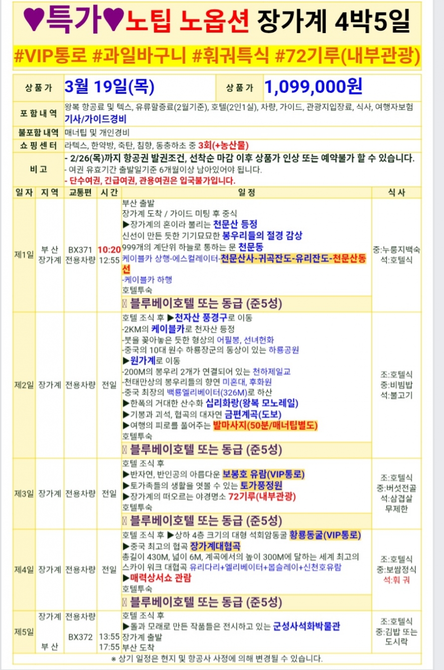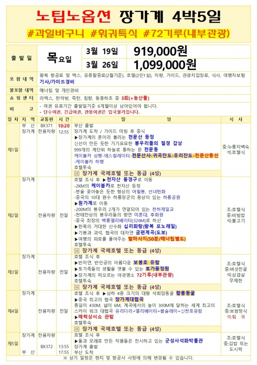 중국 장가계 3박4일, 4박5일 / 공항개별이동 상품 / 증편특가상품 추가!!