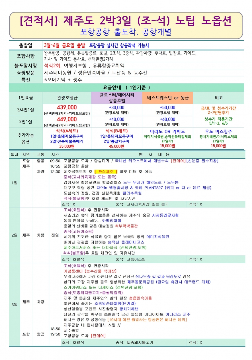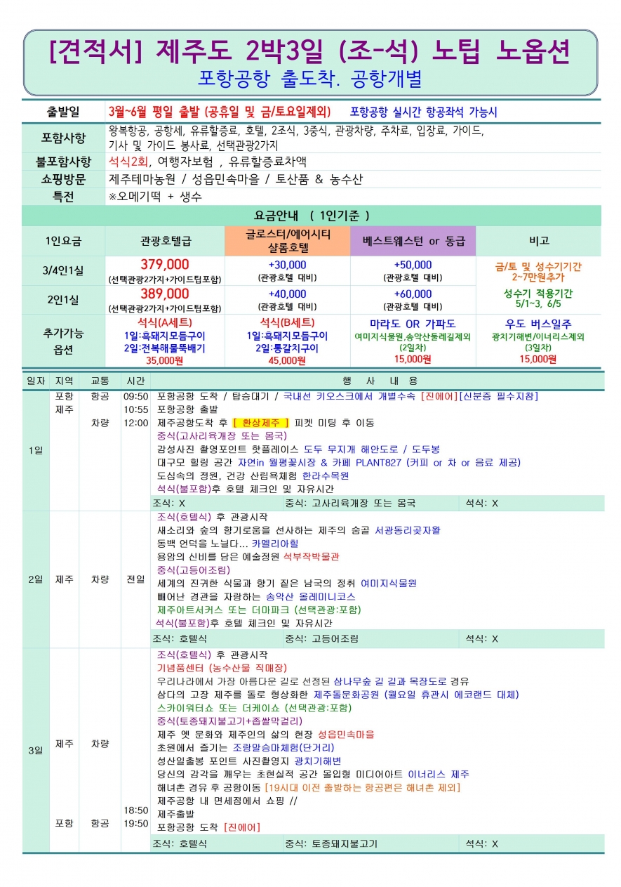제주도 패키지의 경우 출발 요일 및 인원/호텔에 따라 요금이 다양하므로