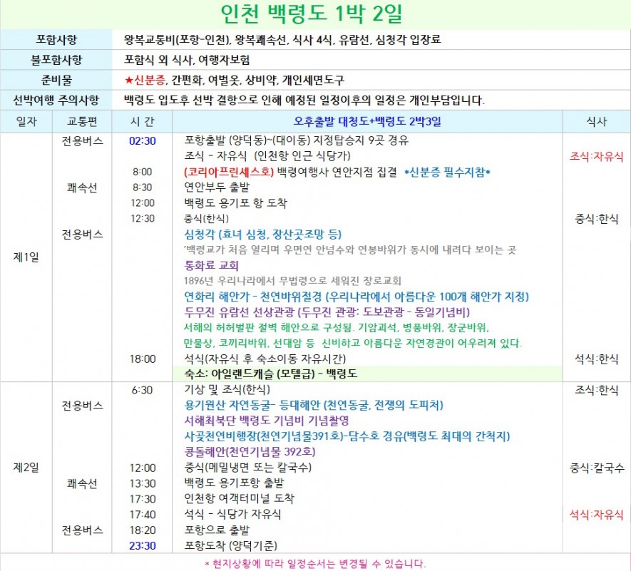 ·포함내역 | 45인승 대형버스, 숙박(모텔급), 식사 5식, 왕복선박비, 유람선비, 현지투어비 |