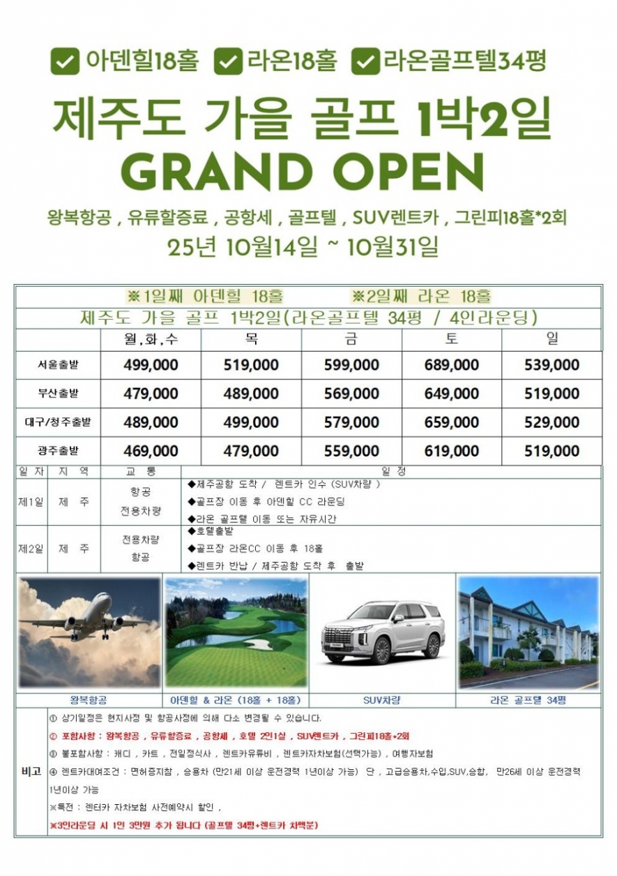 제주도 골프투어 1박2일 패키지 요금 입니다.