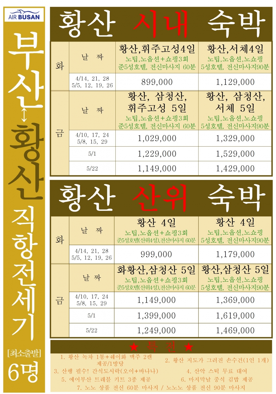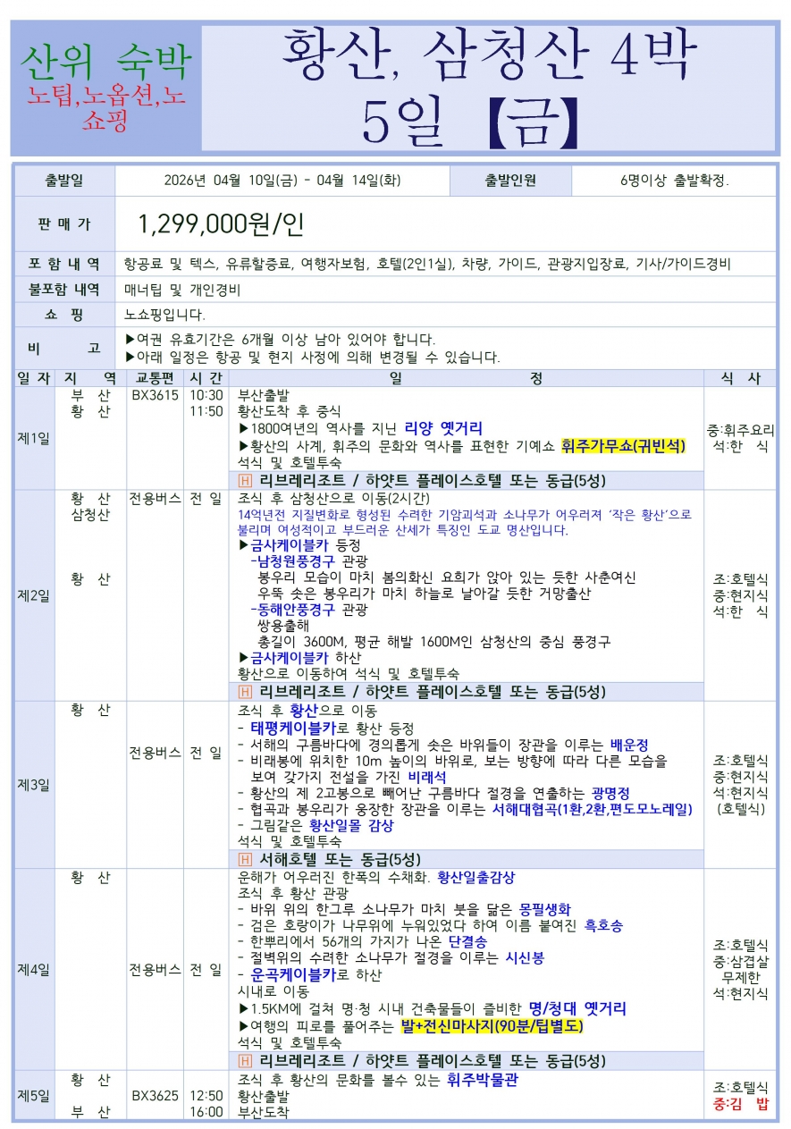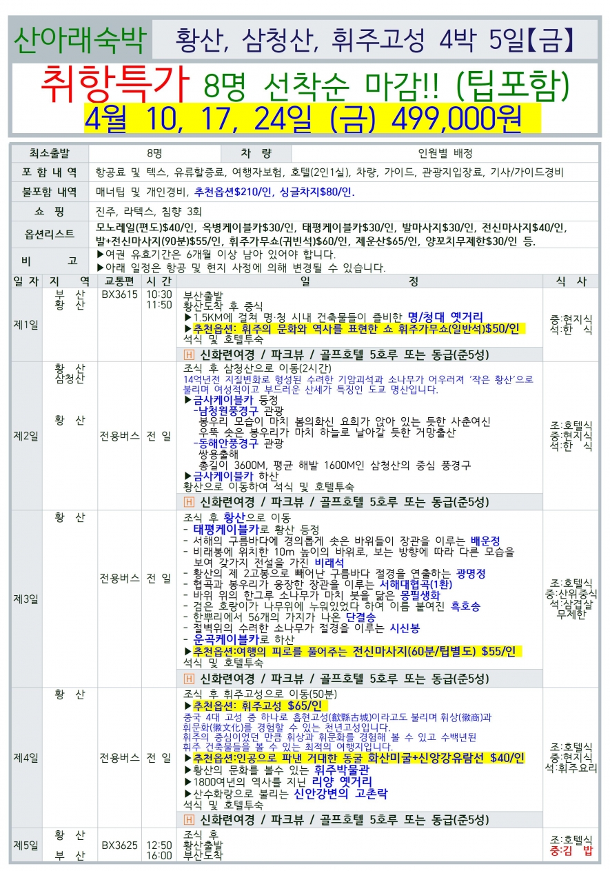 4/10 산위숙박 노노노 1,299,000원/인, 특가 499,000원/인 출발확정