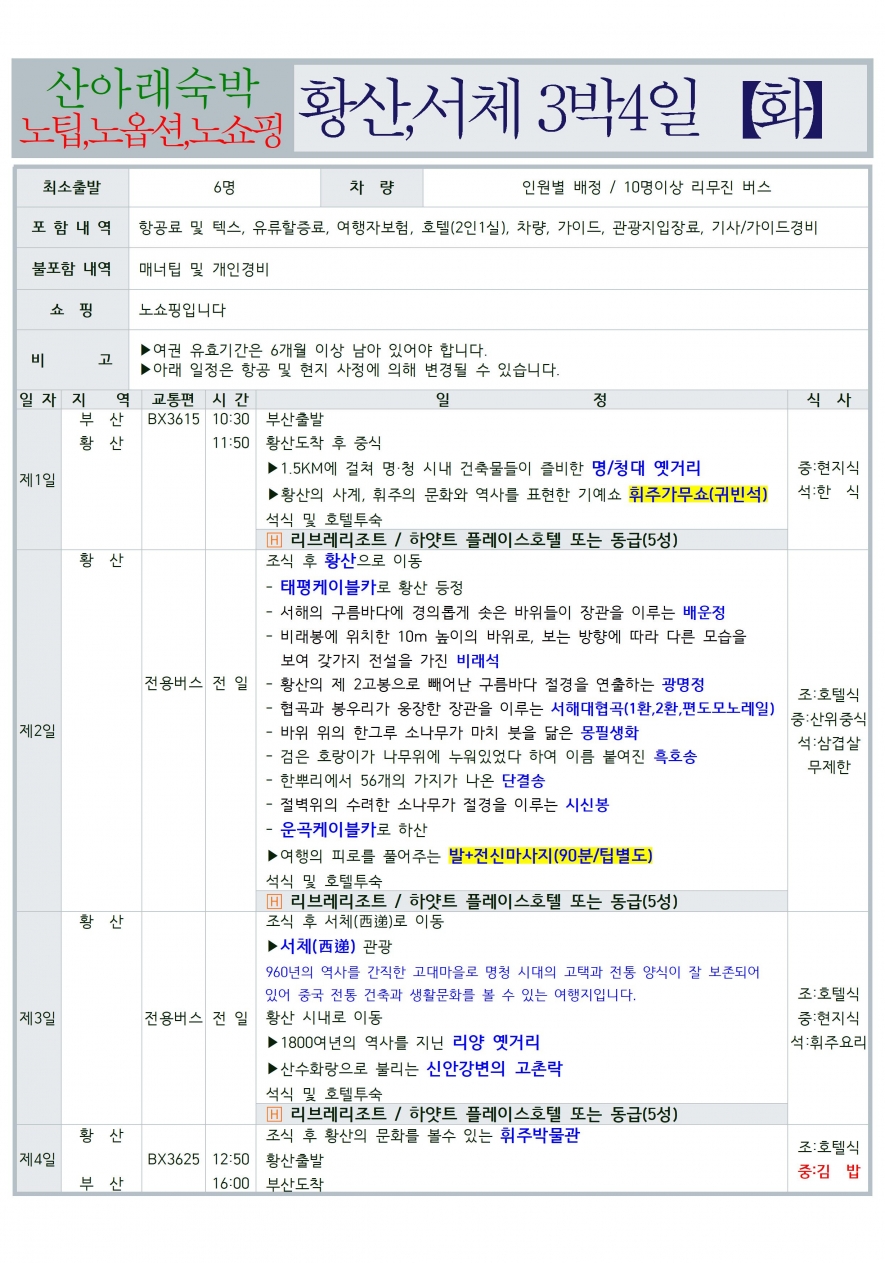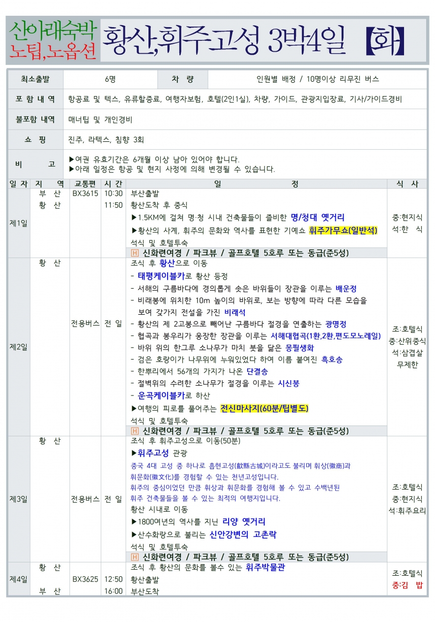 [해외여행] 중국 황산 3박4일, 4박5일 [김해공항개별]