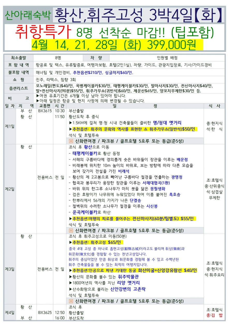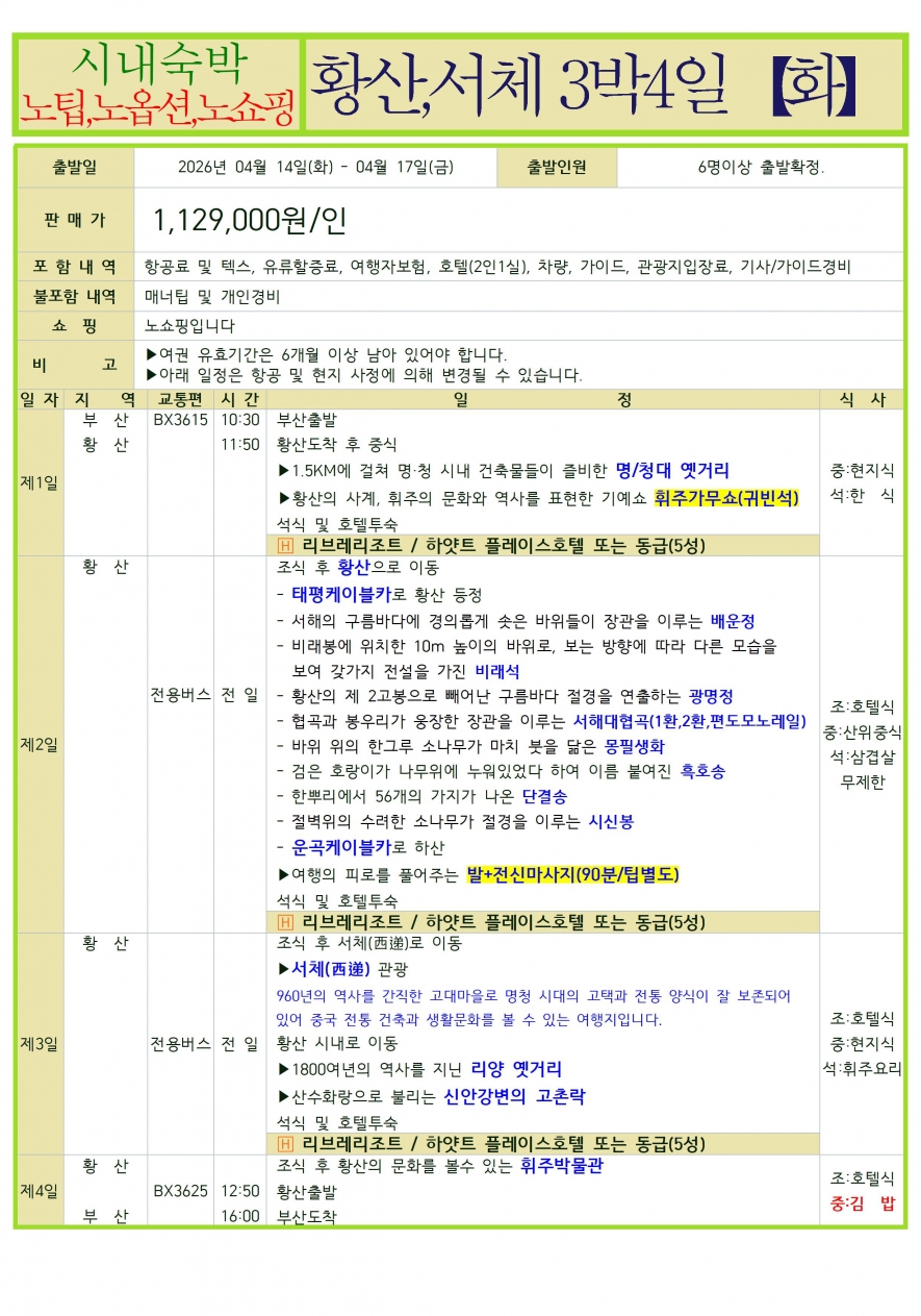 4/14 시내숙박 노노노 1,129,000원/인, 특가 399,000원/인 출발확정