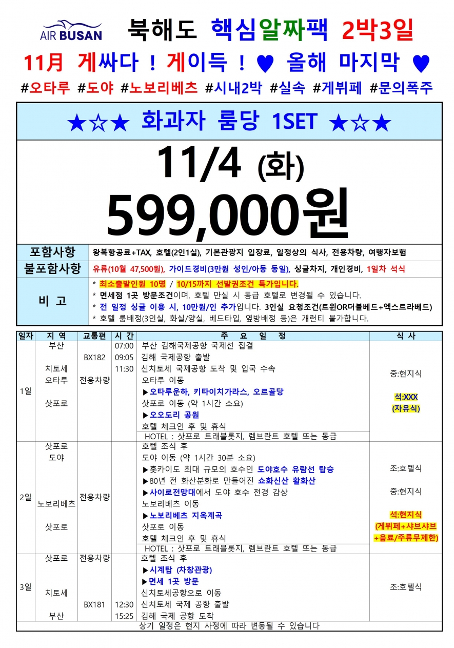 * 2박3일 특가: 전 일정 싱글차지 14만원,1일차 3인실은 요청조건 (트윈or더블베드+엑스트라베드)