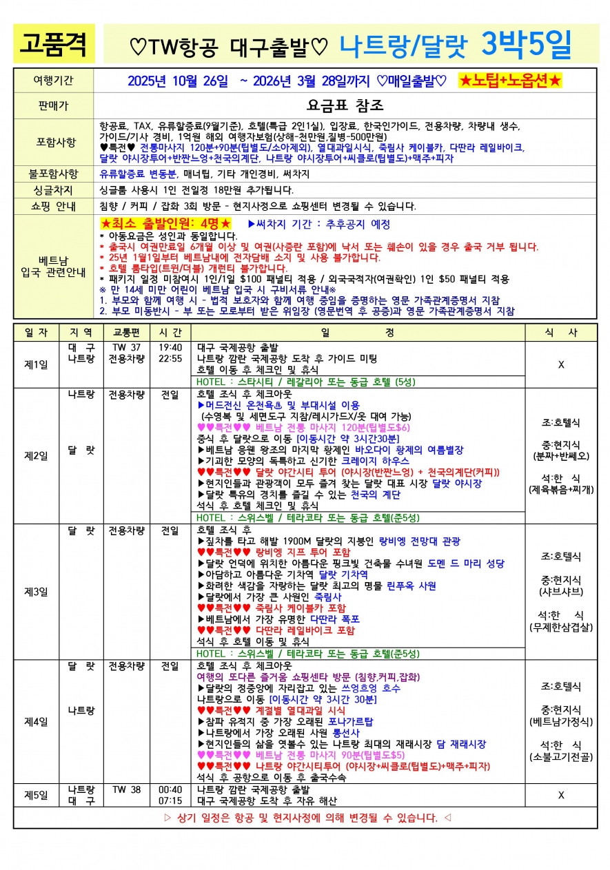 * 최소 4명 출발확정, 출발 4주전 예약자에 한합니다.