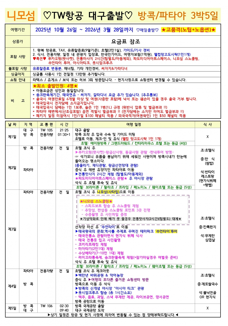대구공항 개별이동상품 - 매일출발!! 매일 4명이상 일정진행됩니다!!