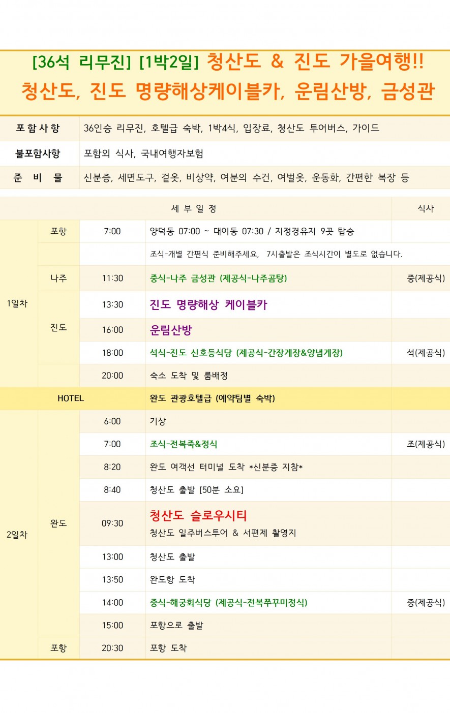 ·포함내역 | 36인승리무진, 호텔급 1박, 식사 4식 제공, 입장료, 가이드 |