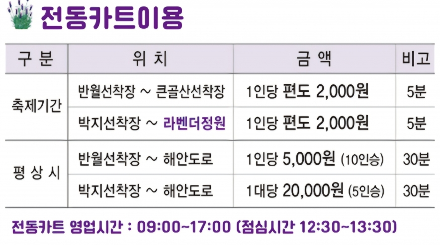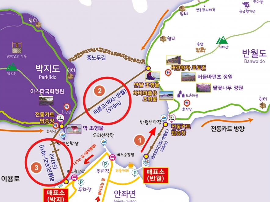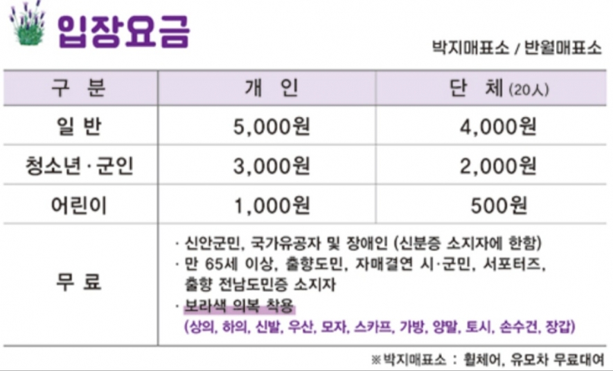" 보랏빛 향연" 신안 퍼플섬 <반월도 & 박지도> 코스안내 : 안좌도 주차장~퍼플교~반월도~박지도~퍼플교~안좌도주차장 퍼플교 입장료 개별 : 5000원 (개인) / 4000원 (단체,20명이상) ▶무료입장 조건 - 보라색 의상 착용시 : (상의,하의,신발,우산,모자,스카프,가방,양말,토시,손수건,장갑) - 만 65세이상, 국가유공자 및 장애인 : (신분증 소지 필수) 신안 퍼플섬
