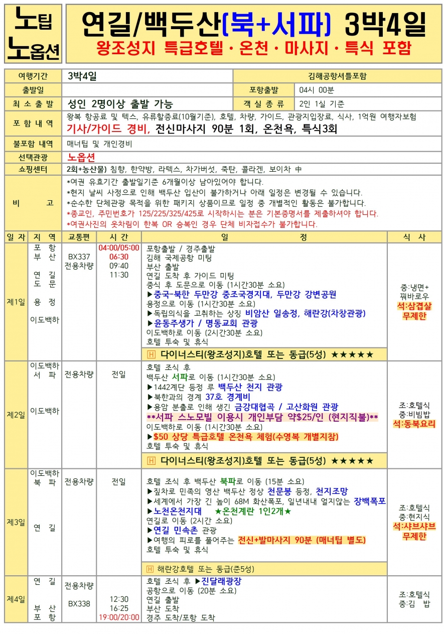 3/25(수) 3박 4일 (서파&북파) 599,000 (10/17까지 이요금,이후 요금인상)
