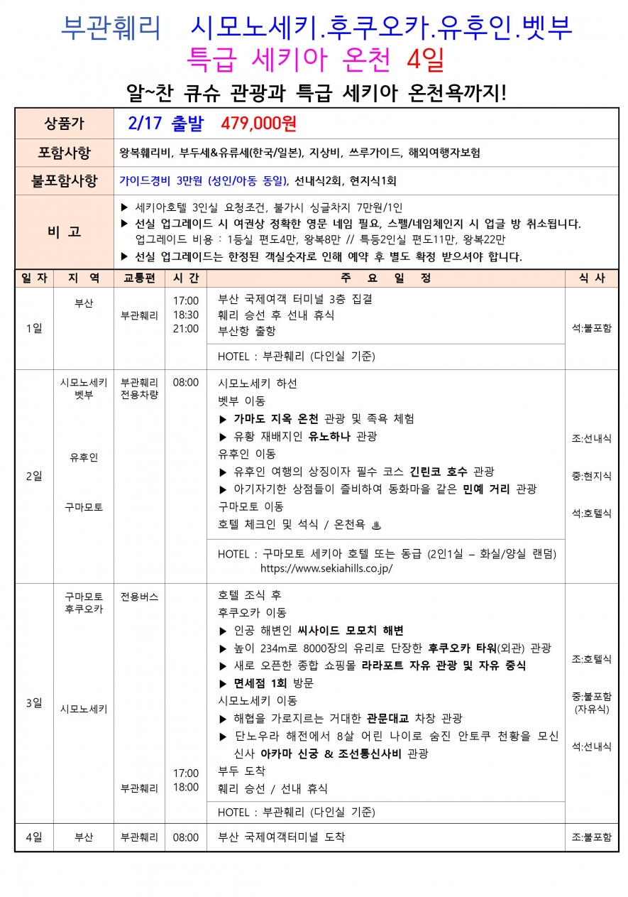 | ·포함내역 | 왕복훼리비, 부두세&유류세(한국/일본), 관광세, 호텔비, 버스비, 입장료, 쓰루가이드, 여행자 보험, 포항-부산항 셔틀 |