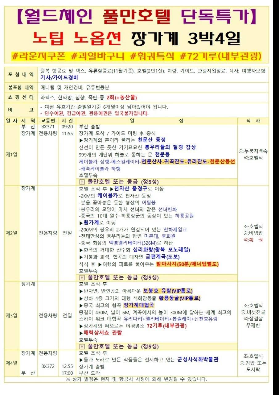 장가계/원가계, 풀만호텔 숙박 3박4일 김해공항 셔틀포함