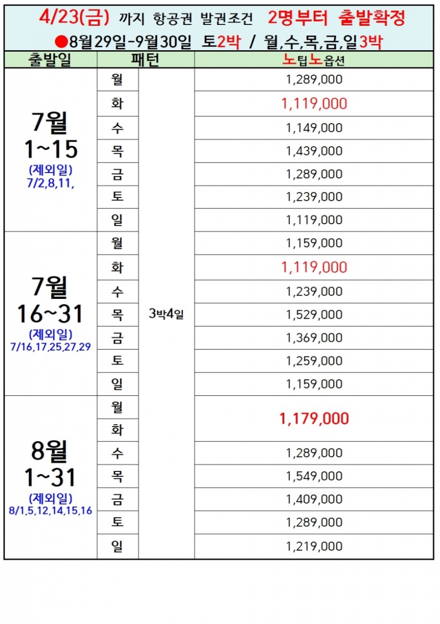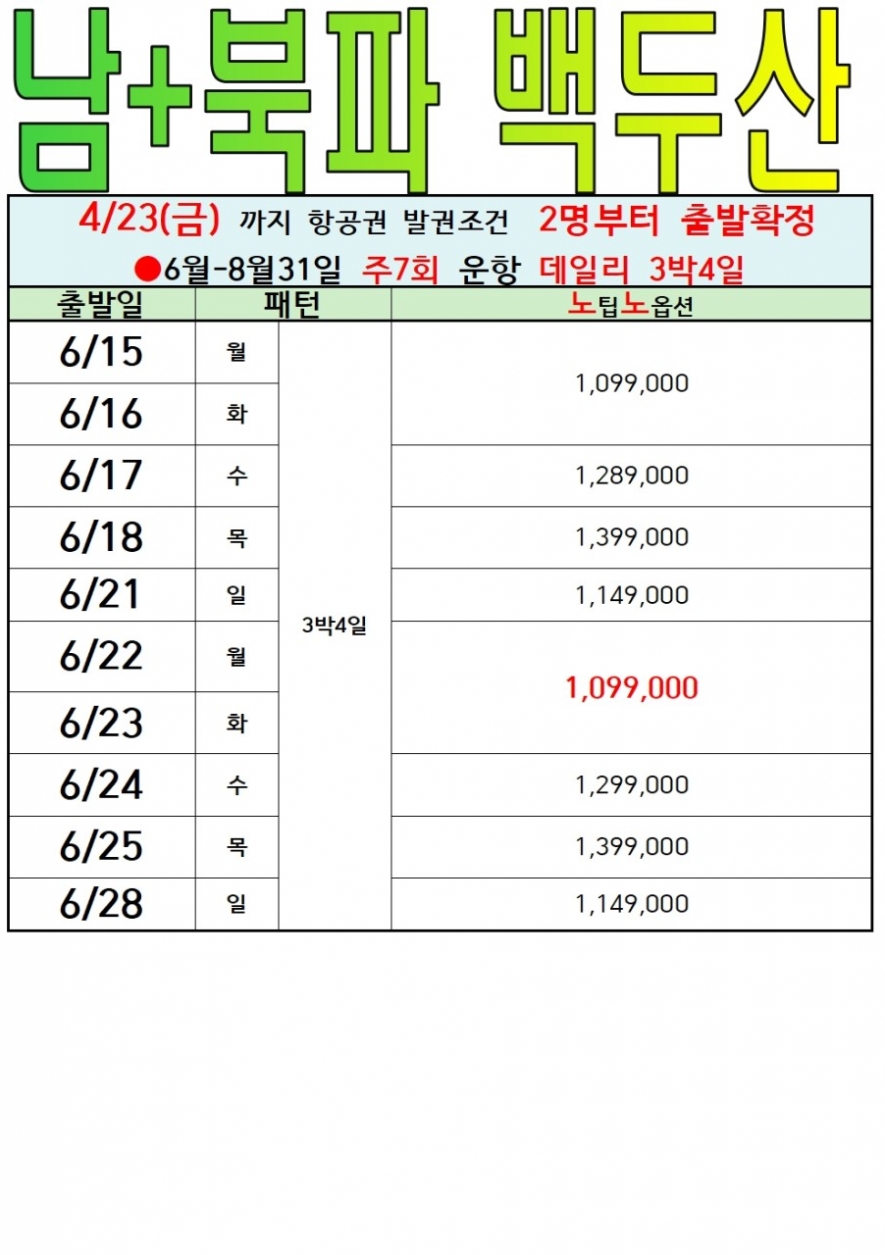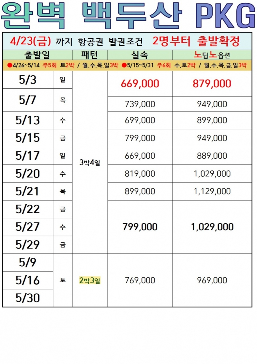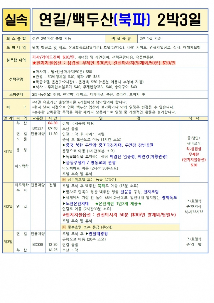 노팁,노옵션 (2박3일(북파), 3박4일(서파&북파)), 남파&북파 2박 3일
