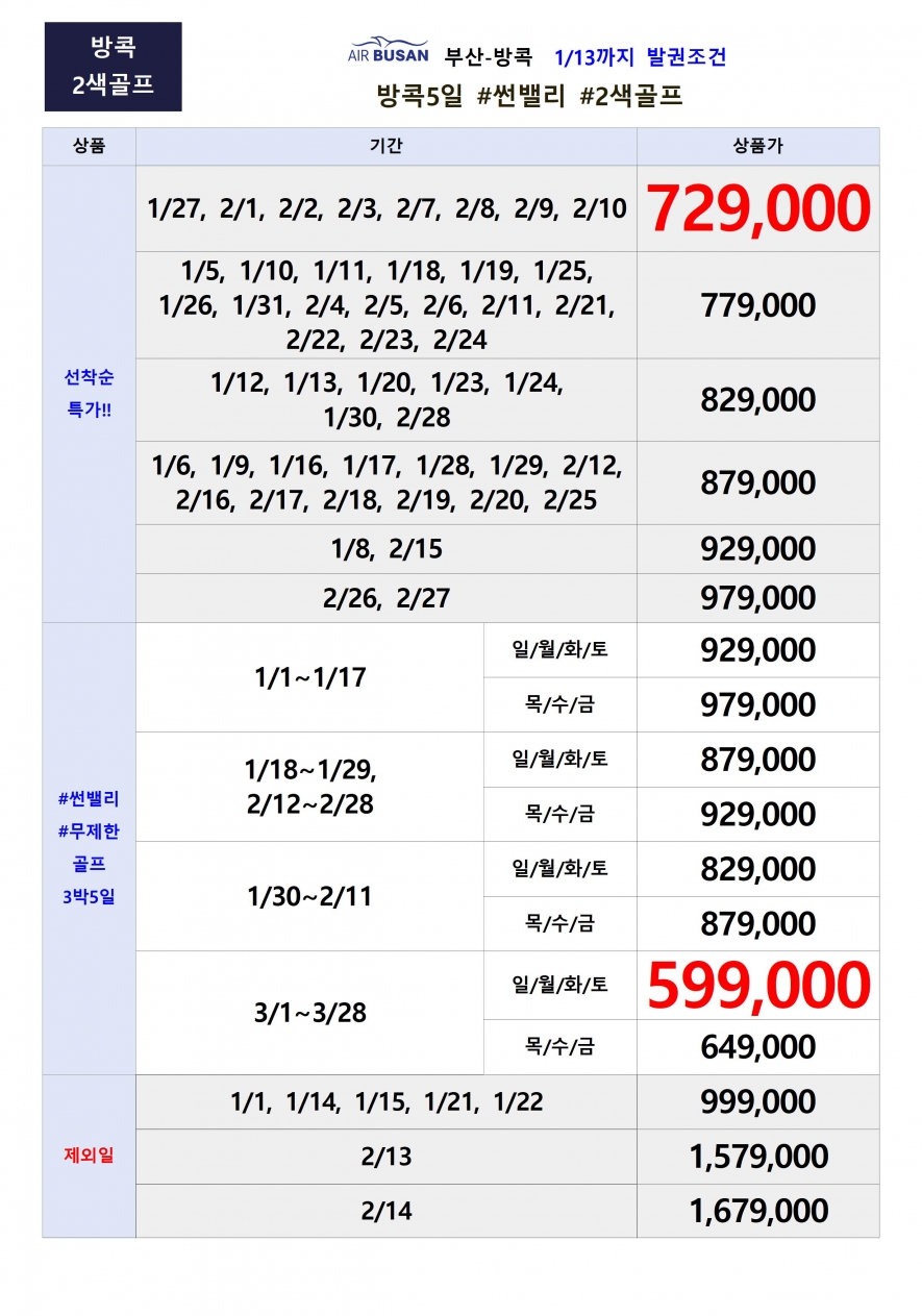 골프 패키지 [김해공항개별] 1/13까지 선발권시 요금