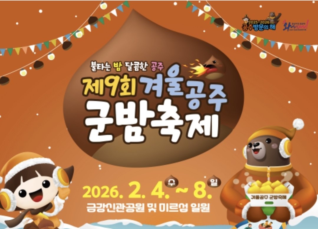 달콤한 공주’를 주제로 2026년 2월 4일(수)부터 8일(일)까지 5일간 금강신관공원 및 미르섬에서 개최된다. 대표 프로그램으로는 지름 2m의 대형 화로에서 알밤뜰망을 이용해 품질 좋은 공주알밤을 직접 구워 먹는 ‘대형화로체험’, 공주에서 생산된 지역 농·축산물을 그릴에 구워 맛볼 수 있는 ‘공주 군밤 그릴존’, 눈썰매와 회전썰매 등 다양한 눈놀이를 즐길 수 있는 ‘겨울공주 눈꽃왕국’ 등 다채로운 볼거리와 즐길 거리가 마련되어 있다. |