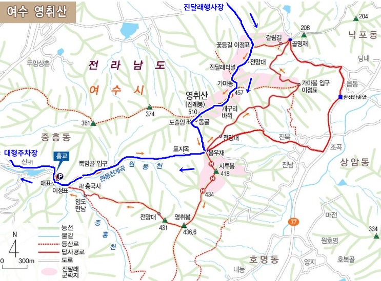 여수 영취산 코스 [7km] 진달래 축제 행사장 - 진달래 군락지 - 가마봉 - 영취산 - 봉우재 - 흥국사 - 주차장 준비물 : 도시락, 생수, 간식, 등산장구일체 등 영취산(여수)