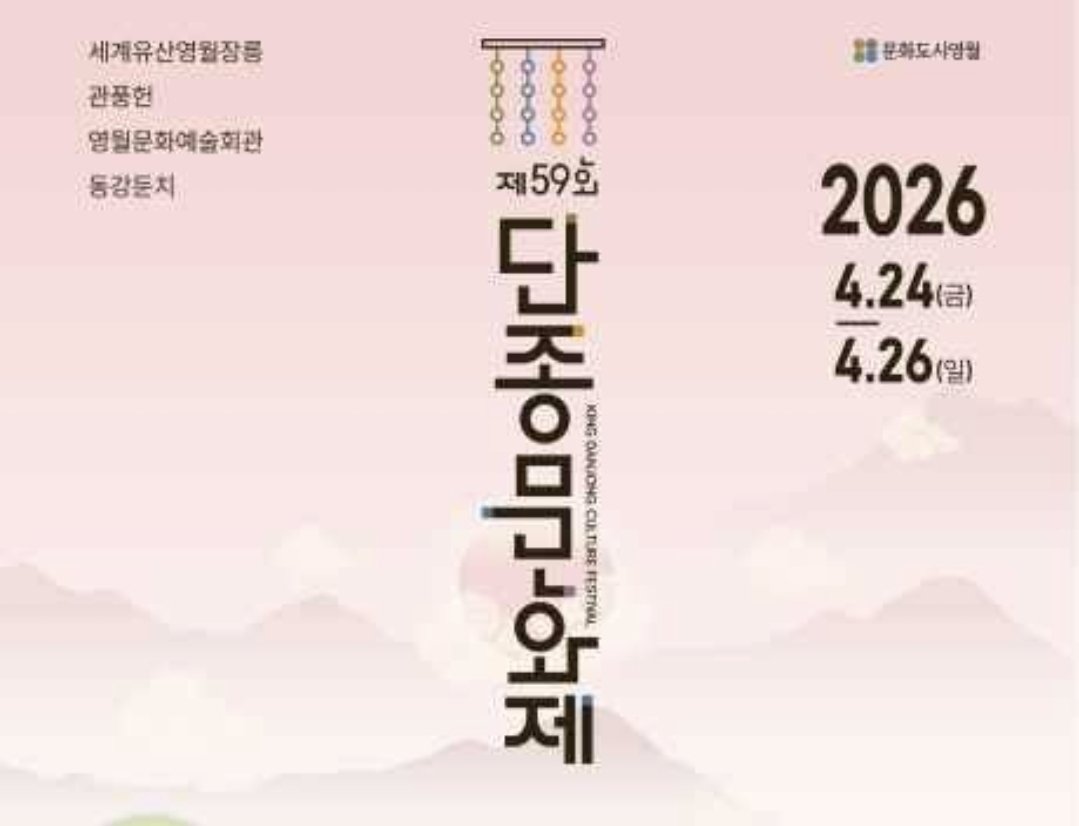 조선 제6대 단종대왕의 능 장릉이 있는 영월에서 제58회 단종문화제가 2026년 4월 24일(금)부터 26일(일)까지 3일간 개최된다. 올해의 단종문화제는 단종국장, 단종제향, 정순왕후 선발대회, 칡 줄 다리기, 체험행사, 참여행사, 공연행사 등 다채로운 행사가 진행 될 예정이다. |