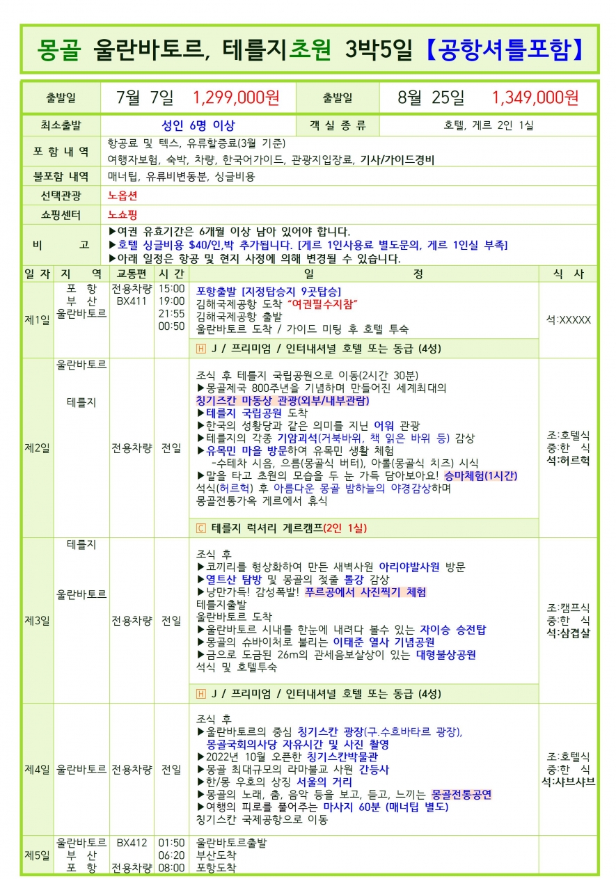 [해외여행] ★셔틀포함★ 몽골 3박5일 [에어부산항공]★